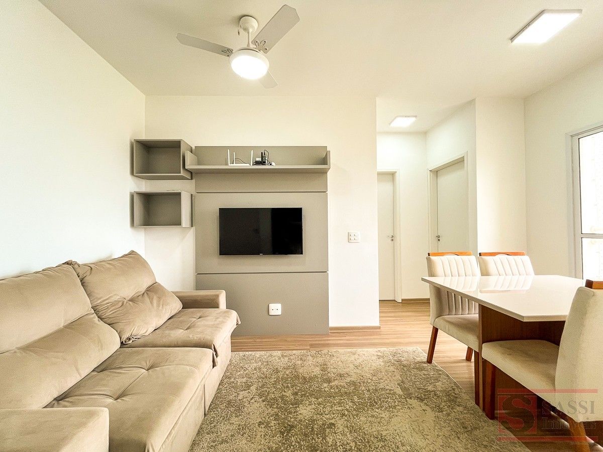 Apartamento Mobiliado e Completo na Vila Camargo Praticidade, conforto e excelente aproveitamento de espaço definem este apartamento na Vila Camargo, ideal para quem busca entrar e morar. O imóvel conta com 2 dormitórios equipados com ventiladores de teto com controle remoto, sendo 1 suíte totalmente mobiliada com guarda-roupa, cama box, painel de TV, gabinete planejado e box em blindex.A sala é aconchegante e funcional, já mobiliada com sofá, mesa com cadeiras, painel de TV com televisão e ventilador de teto com controle remoto, além de sacada com rede de proteção. A cozinha possui móveis planejados, gabinete com pia em granito, geladeira, micro-ondas e cooktop, integrada à lavanderia equipada com máquina de lavar. O banheiro social também conta com gabinete planejado e box em blindex.O apartamento dispõe de aquecimento a gás, piso laminado, teto em laje e oferece vaga de garagem coberta para 1 carro ao lado do elevador, além de vaga exclusiva para moto. Uma excelente opção para quem busca conforto, praticidade e localização estratégica.