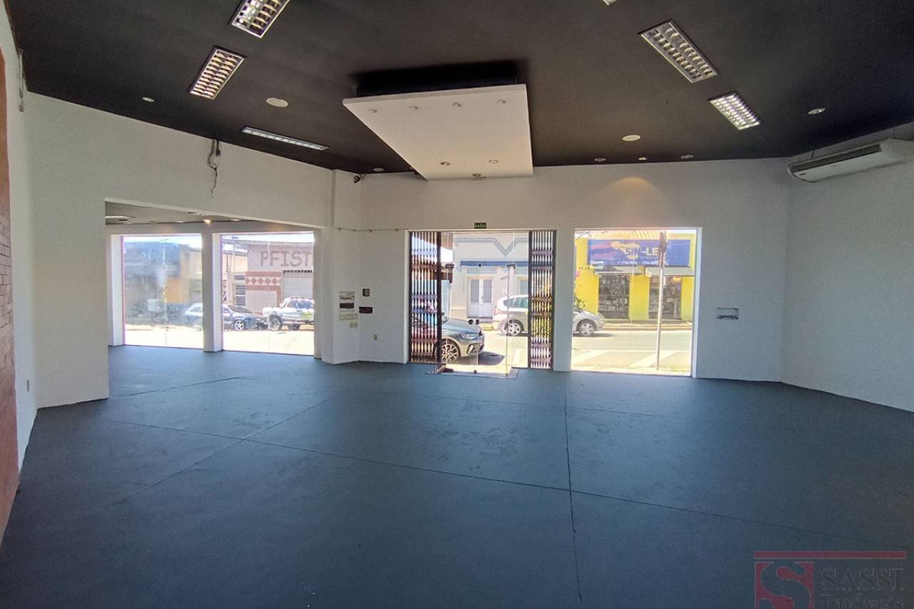 Amplo salão com aproximadamente 100 m², ideal para comércios e serviços. Conta com 2 banheiros, piso cerâmico e contrapiso, além de teto em laje com acabamento em gesso.